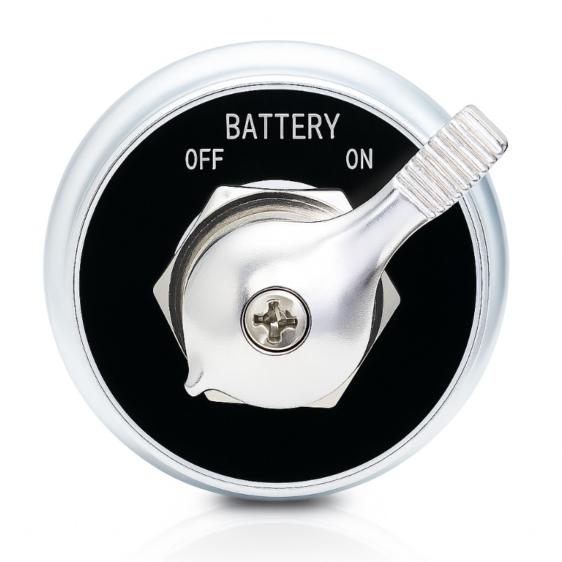 Wyłącznik akumulatora o ciągłym prądzie pracy 300 A umożliwia szybkie odcięcie zasilania całego układu elektrycznego, idealny do samochodów i kamperów/RV jako odłącznik postojowy; montaż w otworze 3/4, konstrukcja uszczelniona z aluminiową płytką ON/OFF, spełnia wymagania CE i zgodnie z regulaminami NHRA jest wymagany przy relokacji akumulatora.”